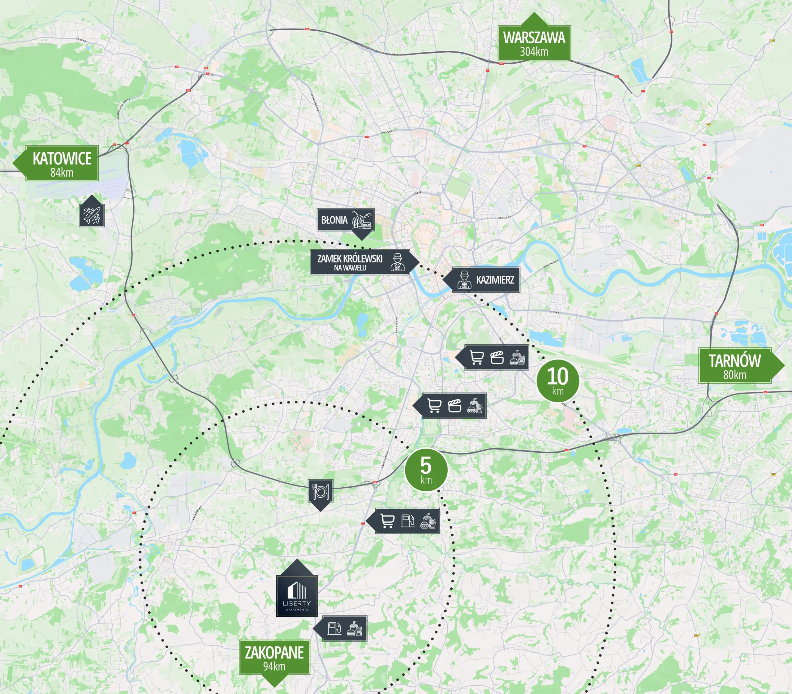 W zaledwie kilkanaście minut dotrzesz do serca Krakowa – na Rynek Główny i Kazimierz. Ciesz się bogatą ofertą kulturalną, klimatycznymi kawiarniami i restauracjami, a po intensywnym dniu w mieście wróć do spokojnego Libertowa, by odetchnąć w kameralnym otoczeniu.